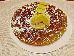 Torta caprese is often served with fresh fruit, particularly berries, or with vanilla ice cream in restaurants.[8] Other accompaniments include whipped cream.[12] Its flavours continue to develop as the cake is rested.[12][13] Usually, the cake is dusted with powdered sugar,[8] which is sometimes shaped into decorative designs. These include an image of Capri with a single palm tree,[1] the words caprese or Capri, or the faraglioni di Capri, a set of sea stacks off the island's shore.[10] Traditionally a design has been imparted by placing a crocheted doily atop the cake and dusting powdered sugar over it.[9]