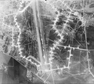 The airfield had a single, 6,700' x 100' asphalt runway laid over pierced steel planking, oriented 16/34. A second (unfinished) runway east of the main runway was used as a crash strip. There were two perimeter tracks, and several other loop taxiways each containing about 50 aircraft parking hardstands. The 99th used the west side of the field, and the RAF the east.[1]
