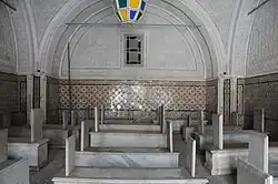 The south-west side opens into the chamber of the Beys,[1] the most important chamber in the complex, housing the tombs of thirteen reigning Beys.[7] The chamber is square, with walls fifteen metres long, and it replicates the proportions of an Ottoman mosque: four large cruciform pillars support a large central cupola which is slightly bulbous in form and flanked by four demi-cupolas on the sides and four in the corners. The only other building with this form in the medina of Tunis is the Sidi Mahrez mosque.[1][5] The intricate decoration of the room blends Italian, Ottoman and local influences; the lower parts of the walls and the pillars are covered in panels of polychrome marble marquetry to a height of 2.5 metres, while finely-sculpted plaster lines the caps of the cupolas.[5]