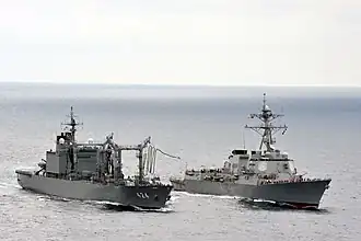 ![]() The US Navy destroyer USS McCampbell, right, conducts a replenishment at sea with Japan Maritime Self-Defense Force fast-combat support ship JDS Hamana in 2012