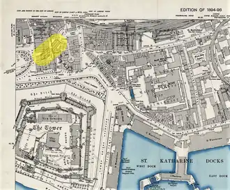 Tower of London station (disused) highlighted on an 1896 map
