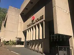 Town Hall House was designed by Ken Woolley of the firm Ancher, Mortlock and Woolley, rebuilt and opened and on 28 June 1977 for City of Sydney Council.[11] It is constructed using concrete with little decoration, which matches to its Brutalist style, and is an example of early 70s Brutalism. The Heritage Council of New South Wales said that Town Hall House is an example of the most important architecture from the modernist architectural movement in the 20th century.[3] The angular geometry of Town Hall House is an element of this style of architecture.[12] In terms of structure, Town Hall House is connected to the Sydney Town Hall by a passage. The two buildings form a contrast between the architectural styles of the 19th and 20th centuries. In addition, the buildings were constructed using different materials—concrete for Town Hall House and sandstone for the town hall.[13][14])[3] Town Hall House is 100 m (330 ft) tall, with 25 levels.[15] The building has developed into a combination of official area and leisure space. It provides a cafe and display area in the public space. There is a library express on the first level.