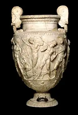 The Townley Vase[1] is a large Roman marble vase of the 2nd century, discovered in 1773 by the Scottish antiquarian and dealer in antiquities Gavin Hamilton in excavating a Roman villa[2] at Monte Cagnola (Montecanino) considered to have been a villa of Antoninus Pius,[3] between Genzano and Civita Lavinia, near the ancient Lanuvium, in Lazio, southeast of Rome.[4] The ovoid vase has volute handles in the manner of a pottery krater. It is carved with a deep frieze in bas-relief, occupying most of the body, illustrating a Bacchanalian procession. Its name comes from the English collector Charles Townley, who purchased it from Hamilton in 1774 for £250. Townley's collection, long on display in his London house in Park Street, was bought for the British Museum after his death in 1805.