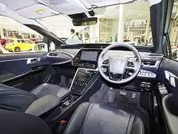 The Mirai is based on the Toyota FCV-R (Fuel Cell Vehicle) concept car, which was unveiled at the 2011 Tokyo Motor Show[17][18] and the Toyota FCV (Fuel Cell Vehicle) concept car, which was unveiled at the 2013 Tokyo Motor Show.[19] The unveiled FCV concept was a bright blue sedan shaped like a drop of water "to emphasize that water is the only substance that hydrogen-powered cars emit from their tailpipes." The FCV has a large grille and other openings to allow cooling air and oxygen intake for use by the fuel cell. According to Toyota, the FCV concept is close in appearance to the expected production version of the car.[20] The FCV size is similar to the Camry.[21] The FCV range is expected to be approximately 700 km (430 mi) under Japan's JC08 test cycle.[22]