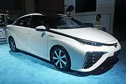 The Toyota Mirai (Japanese: トヨタ・MIRAI, Hepburn: Toyota Mirai) (from mirai (未来), Japanese for 'future') is a mid-size hydrogen fuel cell vehicle (FCV) manufactured by Toyota, and is the first FCV to be mass-produced and sold commercially.[4][5][6][7][8] The Mirai was unveiled at the November 2014 Los Angeles Auto Show.[9] As of November 2022, global sales totaled 21,475 units; the top-selling markets were the U.S. with 11,368 units, Japan with 7,435 and the rest of the world with 2,622.[10]