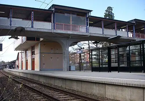 A stop was first opened here by the Stockholm-Nynäs Railway in 1901.[3] After the Stockholm Regional Transport Authority (SL) took over local rail traffic and integrated it into the commuter rail system, a simple ticket booth was placed on the platform in 1973. A modern station facility was built in 1986 but was demolished a few years later[4] to make way for double-tracking work. The current station was opened in August 1995.