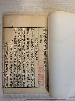 During the 9th and 10th centuries, bound scrolls were gradually replaced by a new book format known as "butterfly binding" (Chinese: 經摺裝; pinyin: jīngzhé zhuāng; lit. 'warp–fold binding'), from the late Tang period onward.[3] This change is tied to the rise of Buddhism and woodblock printing. The accordion–fold books were easier to handle than bound scrolls while reading and reciting sutras. The advantage was that it was now possible to flip to a reference without unfolding the entire document. Woodblock prints also made the new format easier by allowing two mirror images to be easily replicated on a single sheet. Thus two pages were printed on a sheet, which was then folded inwards. The sheets were then pasted together at the fold to make a codex with alternate openings of printed and blank pairs of pages. In the 14th century, the folding was reversed outwards to give continuous printed pages, each backed by a blank hidden page. This development, known as wrapped–back binding (Chinese: 包背裝; pinyin: bāobèi zhuāng), was used during the Southern Song dynasty and the Ming dynasty; it improved upon the butterfly binding by folding pages the opposite way.[4] The next development known as "whirlwind binding" (Chinese: 旋風裝; pinyin: xuànfēng zhuāng) was to secure the first and last leaves to a single large sheet, so that the book could be opened like an accordion.[5] During the 16th and 17th centuries, pasted bindings were replaced by stitched "thread bindings".[6] Also known as side–stitched binding (Chinese: 線裝; pinyin: xiàn zhuāng; lit. 'thread binding'), this type of binding was the final phase of traditional bookbinding in East Asia.[4]