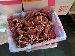 Lap cheong, or Chinese sausage, is a type of cured meat product commonly found in southern regions of China such as Jiangsu, Zhejiang, Sichuan, and Guangdong.[1] Traditional Chinese sausage is made by stuffing seasoned pork into natural casings made from animal intestines, then air-drying it naturally. However, in modern factory production, artificial casings are often used, and hot-air drying is employed to enhance production efficiency.[2] Lap cheong can be eaten on its own and is also widely used as an ingredient in various Cantonese dishes.[3]