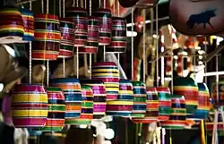 Few countries in the world have as large a selection of traditional toys.[22] They have been made from many different types of materials including wood, cloth, tin, papier-mâché/cartonería, porcelain, clay, palm fronds, corn husks, straw, seeds, scrap metal, glass, and more. This is particularly true of miniatures.[5][6] The toys tend to have simple designs in bright colors.[2] Mexico is unusual in that it has a wide variety of toys fired from clay, especially in Oaxaca.[5] Toys made with a very hard papier-mâché called cartonería have a long history in Mexico. These include dolls, horse figures, piñatas, swords and masks. Most are made in Silao and Celaya. In Mexico City they are also made including items such as piggy banks and bird figures.[23] These toys are usually made by pressing the treated paper over molds.[10]