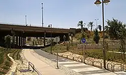 The pedestrian path is a raised boardwalk made from molded concrete planks with an imitation wood finish, laid directly over the original railroad tracks and ties.[4][10] Wood was not used for either the walkway or benches in the project due to the Jerusalem municipality's concern for maintenance and prevention of vandalism,[4] and to avoid damage from the occasional snowfall.[7] To the side of the tracks is a paved bicycle path, which will eventually be linked to the Jerusalem Metropolitan Park that will yield 42 kilometres (26 mi) of continuous cycling trails.[2][7] In between the walking and biking paths in the wider sections is a strip of grass; in narrower sections, ornamental plants border the park.[4] The park was planted with plane trees.[2]