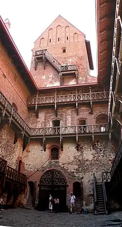 During the second phase, two wings were added, and on the southern side a six-storey (35 metres or 115 feet) keep was built. The keep had movable gates which separated the palace from the castle. The keep was used for several functions; besides serving as another defensive structure, it had a chapel and living quarters. It was linked to the multi-storey Ducal Palace, which had an inner yard. The inner yard had wooden galleries, which ran around the inner wall; these galleries were used to access various support facilities without going inside the palace itself.