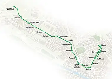 Line 2 currently runs from the airport to Santa Maria Novella railway station, where it interchanges with line 1. From here, the line should run through the city center in two different branches, also serving the Duomo in the initial planning.[16] However, after the recent revisions, the line will probably not pass in Duomo[9] and will run partly underground (4 stops).[17] As of 2022, the route has been finalised for completion at the end of 2023, with new stops at Lavagnini, Poliziano, Parterre, Libertà, Cavour and Piazza San Marco. There will be two Cavour stops as the line will follow the street one-way system.[18]