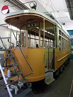 Two railcars have been preserved as historic vehicles: Railcar 68 (ex BVG 5366) was restored to its original condition in 1973 and was in service until 1990. However, changes in legislation led to its decommissioning in 1990. Since 1993, the vehicle has been in the Monumentenhalle of the German Museum of Technology Berlin.[19] Railcar 218 (ex BVG 5403) came to Woltersdorf in 2008 and was refurbished there until the 100th anniversary of operation of the Woltersdorfer Straßenbahn tramway in May 2013 and then presented.[20] The former sidecar 37 (ex BVG 3225) was used as a sheepfold after its time in service in Dessau; no further information is available about its whereabouts.