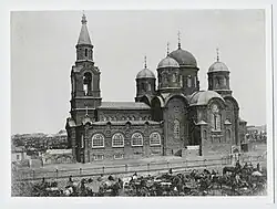 At the close of the 1800s, Yuzivka saw the construction of its first cathedral, dedicated to the Transfiguration of Jesus. On the portion of land near the market that Prince Liven set aside for this purpose, the stone temple was constructed. With funding provided by Bakhmut merchant S. A. Lobas (about 3,500 rubles), construction began in 1883,[2] and the cathedral building was completed in 1884. On 2 November 1886, was the temple's consecration day.[3] It has developed into one of Yuzivka's most intriguing and important buildings, a remarkable architectural achievement for the entire South of Russia as well as the Donbas.[1]