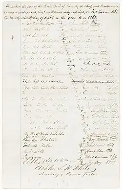 Over the course of 192 days ending November 6, the treaty was signed by a total of 156 Sioux, and 25 Arapaho, in addition to the commissioners, and an additional 34 signatories as witnesses.[55] Although the commissioners signed the document on April 29 along with the Brulé, the party broke up in May, with only two remaining at Fort Laramie to conclude talks there, before traveling up the Missouri River to gather additional signatures from tribes elsewhere.[44]: 44 Throughout this process, no further amendments were made to the terms. As one writer phrased it, "the commissioners essentially cycled Sioux in and out of Fort Laramie ... seeking only the formality of the chiefs' marks and forgoing true agreement in the spirit that the Indians understood it."[33]: 2537–8