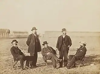 ![]() General William T. Sherman (third from left) and Commissioners in council with chiefs and headmen, Fort Laramie, 1868 | |