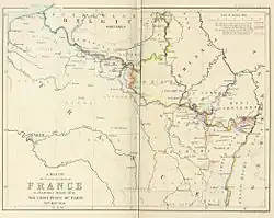 The Allies declared that their aim was to establish a lasting peace based on a just distribution of forces among the powers, and considered it not necessary to impose harsh conditions on France as she had been restored to a monarchy.[3] Thus the preliminary conditions already agreed in Paris were moderate for France so as not to disturb the re-enthronement of the returned Bourbon king: France's borders of 1 June 1792 were confirmed, and in addition, she was allowed to retain Saarbrücken, Saarlouis, Landau, the County of Montbéliard, part of Savoy with Annecy and Chambéry, also Avignon and the Comtat Venaissin as well as artifacts acquired during the war, while on the other hand she had to cede several colonies.[2]