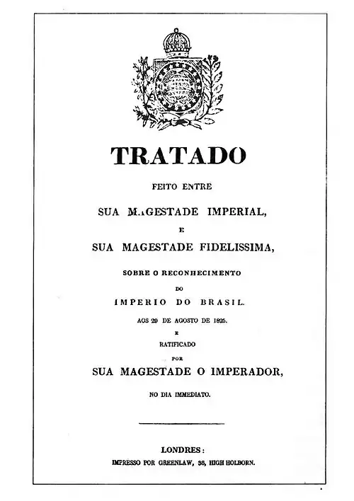 The Treaty of Rio de Janeiro is the treaty between the Kingdom of Portugal and the Empire of Brazil, signed August 29, 1825, which recognized Brazil as an independent nation, formally ending the Brazilian war of independence.