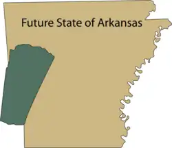 The approximate area ceded shaded in green in relation to the future U.S. state of Arkansas.