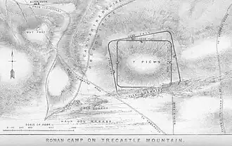 Near the village is the site of Y Pigwn. This consists of two overlaying Roman practice marching camps which are on the summit of Trecastle Mountain. They have been described as 'amongst the best-preserved and best-known Roman temporary camps in Wales.[4] The camps were first discovered 1849 and were planned and described by William Rees at the meeting of the Cambrian Archaeological Association at Breconin 1853.[5] Rees also illustrates Bronze Age burial urns which were found by a Mr Holford in nearby burial mounds. The "Y Pigwm" camps are close to the presumed Roman road linking the Roman Forts at Llandovery and Brecon Gaer, and a small Roman fortlet at "Waun Ddu" lies 700m to the West. There are standing stones and a stone circle nearby.