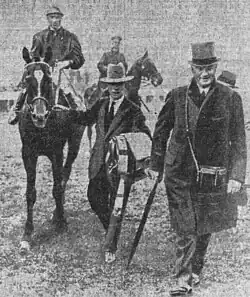 Trigo, a bay horse with a narrow white blaze was bred at the Cloghran Stud in County Dublin, Ireland by his owner, the Belfast grain merchant William Barnett.[1] Barnett inherited the unfashionably-bred[2] mare Athasi from his brother and bred her consistently to the stallion Blandford. In 1925, the pairing produced Athford, who won the Phoenix Plate and was then sent to be trained in England where his wins included the Doncaster Cup. Trigo arrived a year later. The same mating subsequently produced the Irish Derby winners Harinero and Primero. Blandford was a three-time Leading sire in Great Britain & Ireland who sired eleven British Classic Race winners including four who won The Derby. Barnett sent Trigo into training with Jack Rogers at the Curragh. The colt's name, which was pronounced "Trego",[3] is the Spanish word for "wheat",[4] reflecting his owner's business interests.[5]