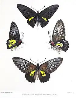 Troides plateni, the Dr. Platen's birdwing, is a birdwing butterfly endemic to Palawan, Balabac, Dumaran, and the Calamian Islands in the Philippines. It is named for Dr. Carl Constantin Platen.