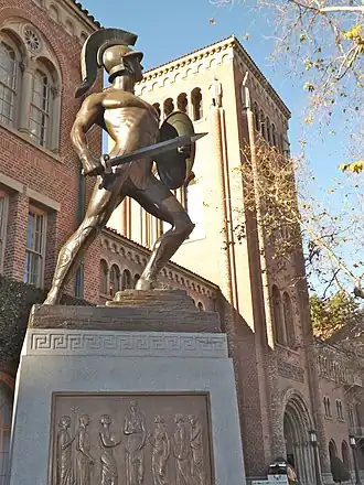 Tommy Trojan, officially known as the Trojan Shrine, is one of the most recognizable figures of school pride at the University of Southern California in Los Angeles, California, United States. The life-size bronze statue of a Trojan warrior stands in the center of campus and serves as a popular meeting spot, as well as a centerpiece for a number of campus events. It is the most popular unofficial mascot of the university.