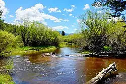 North American beaver (Castor canadensis) inhabit multiple reaches of Trout Creek and Cold Creek.[9][10] Beaver were re-introduced to the Tahoe Basin by the CDFG and the U. S. Forest Service between 1934 and 1949 in order to prevent stream degradation and to promote wetland restoration. The presence of beaver dams has also been shown to either increase the number of fish, their size, or both, in a study of brook, rainbow and brown trout in Sagehen Creek, which flows into the Little Truckee River at an altitude of 5,800 feet (1,800 m) and is a stream typical of the eastern slope of the northern Sierra Nevada.[11] Not only have aspen and cottonwood survived ongoing beaver colonization but a recent study of ten Tahoe streams, including Trout Creek and Cold Creek, utilizing aerial multispectral videography has shown that deciduous, thick herbaceous, and thin herbaceous vegetation are more highly concentrated near beaver dams, whereas coniferous trees are decreased.[10] Benefits of beaver dams include removal of sediment and excessive pollutants travelling downstream, which improves lake clarity, which was shown to worsen recently when beaver dams were removed in nearby Taylor Creek and Ward Creek.[12]