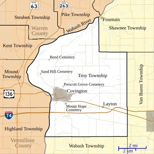 Troy Township contains the Fountain County seat of Covington, in the western part of the county near the river. At one time, the unincorporated community of Layton existed in the southeast part of the township along the present route of U.S. Route 136.