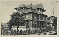 Following the collapse of the Austro-Hungarian Empire, the Polish–Ukrainian War and the Polish–Soviet War, Truskawiec became part of Poland again.[10] Administratively it was the seat of Gmina Truskawiec, located in the Drohobycz County of the Lwów Voivodeship. As the spa was not destroyed in these conflicts, activity resumed quickly, as early as 1920[10] and Truskawiec soon emerged as a popular spa destination. In the 1920s and 1930s, almost 300 hotels, villas and guest houses were built here. The town was awarded three gold medals as the country's best spa resort.[7] Next to Krynica-Zdrój, it was the most visited and most popular resort in Poland.[11] A number of notable Polish personalities visited Truskawiec during that era, including politicians (Stanisław Wojciechowski, Józef Piłsudski, Wincenty Witos, Ignacy Daszyński), artists (Eugeniusz Bodo, Adolf Dymsza, Julian Tuwim, Stanisław Ignacy Witkiewicz, Bruno Schulz, Zofia Nałkowska, Marian Hemar, Hanka Ordonówna, Jan Kiepura, Zofia Batycka, Antoni Słonimski), athletes (Stanisława Walasiewicz, Halina Konopacka, Janusz Kusociński) and Generals Stanisław Maczek and Kazimierz Sosnkowski.[11] Numerous guests from abroad came there as well.[11] In 1935, the Prime Minister and future president of Estonia Konstantin Päts visited the spa.[11] Rajmund Jarosz, who was the owner of the spa since 1911, founded the Museum of Natural History (Muzeum Przyrodnicze) and a salt-sulfur pool, later destroyed during World War II.[11]