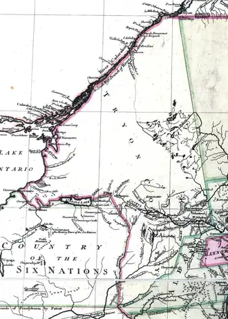 Tryon County was a county in the colonial Province of New York in the British American colonies. It was created from Albany County on March 24, 1772, and was named for William Tryon, the last provincial governor of New York.[1] The county's boundaries extended much further than any current county. Its eastern boundary with the also-new Charlotte County ran "from the Mohawk River to the Canada line, at a point near the old village of St. Regis and passing south to the Mohawk between Schenectady and Albany." It extended north to the St. Lawrence River; its western boundary was the Treaty of Fort Stanwix's Line of Property, following the Unadilla River, Oneida Lake, Onondaga River and Oswego River to Lake Ontario, as the Iroquois Confederacy still controlled locations further west in the Indian Reserve. Tryon County's seat was Johnstown, which is today the county seat of Fulton County.[2] The Tryon County Courthouse, built in 1772–1773, was listed on the National Register of Historic Places in 1972.[3] The Tryon County Jail, also built in 1772–1773, was listed on the National Register of Historic Places in 1981.[3]