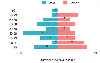 According to the 2002 Poland census, there were 100 people residing in Trzcianka-Kolonia village, of whom 48% were male and 52% were female. In the village, the population was spread out, with 28% under the age of 18, 34% from 18 to 44, 22% from 45 to 64, and 16% who were 65 years of age or older.[2]