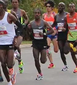 He attempted to defend his title in the 2011 London Marathon, but could not keep up with the leaders' pace at the 30 km mark, and had to settle for fifth place with a time of 2:07:47.[20] He was not chosen for the Ethiopian 2012 London Olympics marathon team despite the pleas of Haile Gebrselassie to their country's selection committee.[1] At the Great Manchester Run in May he came runner-up to Gebrselassie but ran a personal best of 27:56 minutes.[21] He entered the 2012 Chicago Marathon and went one better than his 2010 performance to win the race. He gradually pulled ahead of the pack in the second half of the race and managed a course record time of 2:04:38, also a personal best.[22]