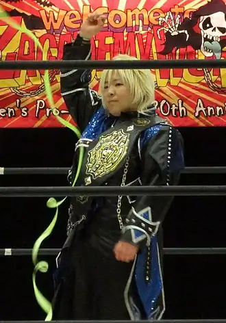 Following her Openweight Championship reign, Kuragaki formed the Harukura tag team with Kayoko Haruyama, with the two becoming multi-time JWP Tag Team Champions and the first-ever Daily Sports Women's Tag Team Champions together during the next years.[1] In early December 2011, Kuragaki made her American debut, when she took part in the three-day JoshiMania weekend, held by the Chikara promotion in Philadelphia, Pennsylvania.[9][10][11] On December 23, 2011, Kuragaki defeated Hailey Hatred to regain the JWP Openweight Championship.[12] After a four-month reign, she lost the title to Haruyama.[13] In early 2012, Kuragaki began making regular appearances for the Oz Academy promotion, where she is one of the few wrestlers not representing any of the promotion's stables.[2] Kuragaki returned to Chikara in September 2012 to take part in the 2012 King of Trios in Easton, Pennsylvania. Kuragaki, Command Bolshoi and Kaori Yoneyama, representing JWP, made it to the second round of the tournament, before being eliminated by F.I.S.T. (Chuck Taylor, Icarus and Johnny Gargano).[14][15][16] In January 2013, Harukura started their third as both the Daily Sports Women's Tag Team and JWP Tag Team Champions with a win over the team of Arisa Nakajima and Command Bolshoi.[17] After a seven-month reign, they lost the titles to Heart Move (Hanako Nakamori and Morii).[18] On August 22, 2013, Kuragaki announced that she would be going freelance following October 14.[19][20][21] Kuragaki was defeated by Haruyama in her final match as a JWP wrestler.[22][23]