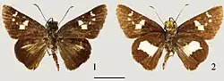 1. ^ Jian-Qing Zhu, Hideyuki Chiba & Li-Wei Wu 2016. Tsukiyamaia, a new genus of the tribe Baorini (Lepidoptera, Hesperiidae, Hesperiinae). ZooKeys 555: 37-55. doi:10.3897/zookeys.555.6144. This article incorporates text available under the CC BY 4.0 license.