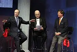 In 2000, Carlson co-hosted the short-lived show The Spin Room on CNN.[64] In 2001, he was appointed co-host of Crossfire, in which Carlson and Robert Novak represented the political right (alternating on different nights), while James Carville and Paul Begala, also alternating as hosts, represented the left.[64]