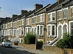 Tufnell Park Road, a straight of 1.24 kilometres (0.77 mi), was sometimes conjectured by historians to follow the line of a Roman track.[1] There is no evidence of Roman activity in the area and a supposed Roman camp marked on Dent's 1805 parish map has been shown by Museum of London Archaeology excavations to probably be a misidentified medieval moated site.[1] The road has for centuries been an east–west connector between the roads from the hearts of Islington and Camden which converge into a major northern route at Archway market place, across 500 metres of Dartmouth Park district to the north.