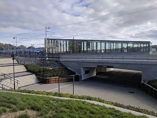 Tungelsta is a station on Stockholm's commuter rail network, located in the locality of Tungelsta within Haninge Municipality. It is situated on the Nynäs Line.[2] The station was originally opened in 1901. On December 3, 2012, the station was expanded when the double track between Västerhaninge and Tungelsta was completed,[3] followed by the double track between Tungelsta and Hemfosa in December 2016. As of 2015, approximately 400 passengers boarded trains at Tungelsta each weekday.