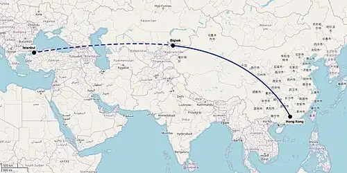 | Stopover | Manas International Airport, Bishkek, Kyrgyzstan |