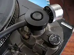 Due to the offset between the cartridge's axis (which is approximately tangential to the disc) and the tonearm's pivot, the force applied (through friction) by the rotating disc to the cartridge tends to draw the tonearm toward the center of the record and distort the balance of the sound and of the wear suffered by the stylus and the vinyl groove. To prevent this, an appropriately-sized opposing force (a rotational torque) is applied at the tonearm. This is accomplished in various ways by dedicated mechanisms, depending on the tonearm's manufacturer, and ranging from a small counterweight adjustable by a knob, to adjustable spring or magnetic mechanisms, usually calibrated in grams of force.[1]
