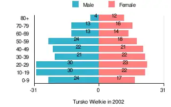 According to the 2002 Poland census, there were 346 people residing in Tursko Wielkie village, of whom 52.3% were male and 47.7% were female. In the village, the population was spread out, with 24.8% under the age of 18, 36.2% from 18 to 44, 19.7% from 45 to 64, and 19.3% who were 65 years of age or older.[2]