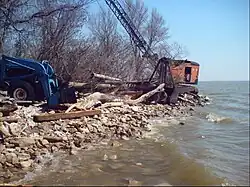 The island has been eroded by Lake Erie, and the lighthouse damaged by winter storms and it is one of the most endangered lighthouses in the nation.[1] The island was once over 6 acres in the 19th century, but is now less than an acre.[2] It is the only sand and gravel island in the whole lake, and is more vulnerable, and there are periodic efforts to try to rebuild the island, save the lighthouse, and make a park area.[1]