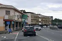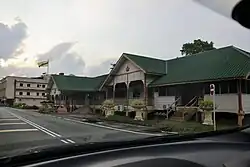 Tutong town is located on the northern bank of the Tutong River and is crossed by an old main road that served as the primary route before the 1980s, connecting Bandar Seri Begawan to the east and Seria and Kuala Belait to the west. It has long been the heart of administrative activity in the Tutong District, serving as a central hub for government operations since the introduction of modern administration by the British Resident in the early 20th century.[5] The town itself is a small settlement within the area of Kampong Petani. Originally, the village was situated along a small river, a tributary of the Tutong River, which now lies at the site of the Fire and Rescue Department in Tutong town.[6]