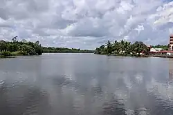 Downstream along the Tutong River, with the fire and police stations located on the right-hand side