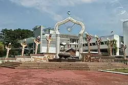 The Tugu Peringatan Dewan Kemasyarakat Daerah, constructed around 1992, is located in front of the community hall. Made entirely of concrete, the monument was inaugurated by Sultan Hassanal Bolkiah during a thanksgiving and royal visit ceremony to the Tutong District, marking the 25th anniversary of his ascension to the throne on 26 October 1992. The construction was a collaboration between Jasra E.L.F. Company and the Brunei government.[47]