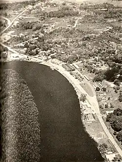 In 1900, the location was a small settlement with just four or five simple houses and a few shops.[8] The village began its transformation with the construction of its first government building in 1910,[8] followed by its establishment in 1911,[9] and the commencement of oil exploration in 1913.[10] In 1918, the village founded its first Malay vernacular school, marking the beginning of its growth and modernisation, which culminated in the village's name change to Tutong.[11] In 1923, Brunei Shell Petroleum (BSP) had drilled eight exploratory wells,[12] and a 30 miles (48 km) road connecting Brunei Town to Tutong was constructed between 1924 and 1925 at a cost of B$22,000, running along the northern bank of the Tutong River.[13] A wireless communication system began operating in 1924,[14] and the Brunei-Tutong road was officially opened in 1927.[15] The town was incorporated as a sanitary board area in 1929, responsible for overseeing cleanliness and development.[16] That same year, the road was extended to Seria, supported by two jetties, and ferry services were introduced in 1945.[13]