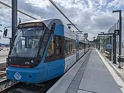 Tvärbanan is served by tram types designated A32 and A35. The A32, Flexity Swift from Bombardier, began operating on Tvärbanan in 1999. The A35, Urbos AXL from CAF was introduced in connection with the extension to Solna in October 2013.[12] Both types are approximately 30 meters long and have 72–78 seats each, with two trams usually coupled to increase capacity, leading to a train of around 60 meters long.[13][14] This compares to the 140 meter metro trains and the 214 meter commuter trains.