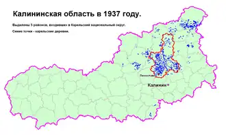 On July 8, 1937, on the territory of the compact settlement of the Tver Karelians, the Karelian National Okrug was created, consisting of three already existing and two newly created districts: Likhoslavl, Novokarelsky, Rameshkovsky, Maksatikhinsky, Kozlovsky. The capital of the district was the city of Likhoslavl. During the first year of the Okrug's existence, many Karelian cultural and educational institutions were created, but on February 25, 1939, it ceased to exist, and many activists of the Karelian movement in the Tver region were repressed.[4]