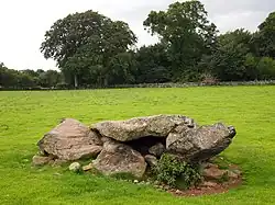 The burial chamber is a collapsed megalithic dolmen with a fallen capstone slab, roughly measuring 3.6 metres by 2.6 metres, resting on two flattened stones, both being 1.3 metres long.[1] The collapse of the structure may have been the result of the removal of a stone before 1873, as depicted by the date of when a drawing of the structure was produced.[2]