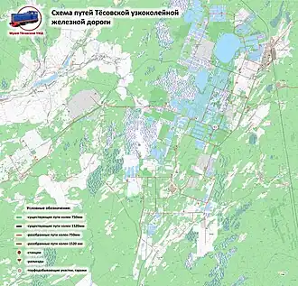 1. ^ Болашенко, С. (11 February 2007). УЗКОКОЛЕЙНАЯ ЖЕЛЕЗНАЯ ДОРОГА ТЁСОВСКОГО ТРАНСПОРТНОГО УПРАВЛЕНИЯ СХЕМЫ И ТОПОГРАФИЧЕСКИЕ КАРТЫ [Tyosovo peat narrow-gauge railway schematics and maps] (in Russian).